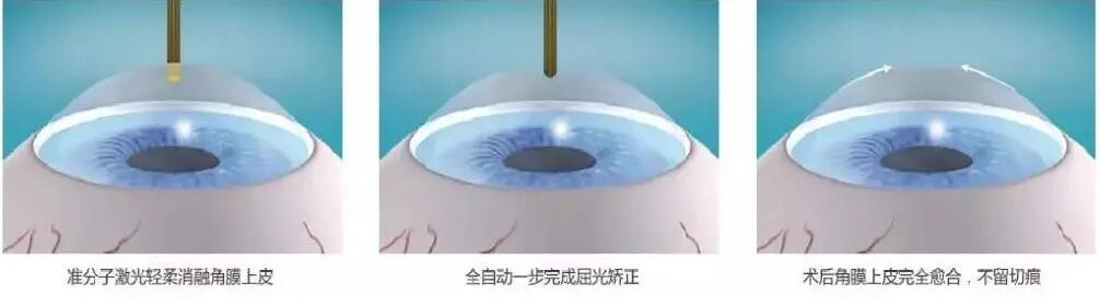 以SMART全激光手术为代表。手术使用精准的准分子激光,几十秒内一起消融角膜上皮层和角膜基质层,一步到位。因此没有角膜瓣,在显微镜下基本看不到手术的痕迹,避免了所有角膜瓣并发症的风险。而被消融的上皮层,因为其强大的再生能力,一般会在数天内长合完成。