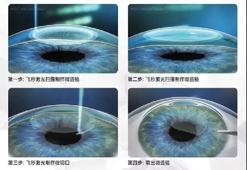 以飞秒激光小切口角膜基质透镜取出术为代表,也就是SMILE“全飞秒”。全程只需用到飞秒激光。先是利用飞秒激光,在角膜的基质层分离切削出一个凸透镜,再在角膜缘附近切开一个约2-4mm的小切口,之后将这个削出来的透镜分离并取出。