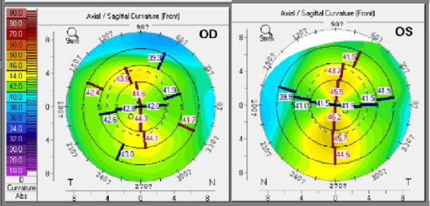 不仅如此,他的角膜地形图也有着与屈光度类似的表现,左眼角膜曲率(见下图)明显高于右眼,并不能排除圆锥角膜的可能性。这里给大家科普一下“圆锥角膜”:这是一种角膜逐渐变薄,向前凸出呈“圆锥”形,进而导致视力逐渐下降,且无法用普通眼镜矫正的眼部疾病。需要特别提醒的是,有圆锥角膜倾向的人不建议做近视激光手术。