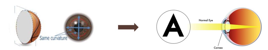 角膜在各方向弯曲弧度相同(圆球形),外界光线进入眼内后形成一个焦点。