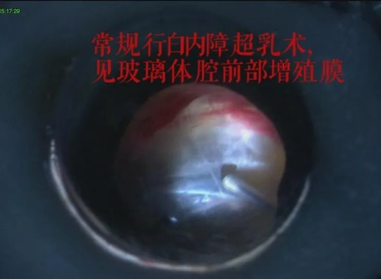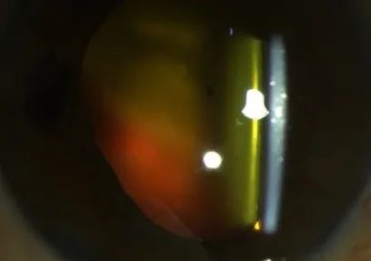 术前前节照相,显示晶体混浊,玻璃体血性浑浊