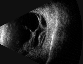 术前B超,显示外伤性视网膜脱离,眼内增殖严重