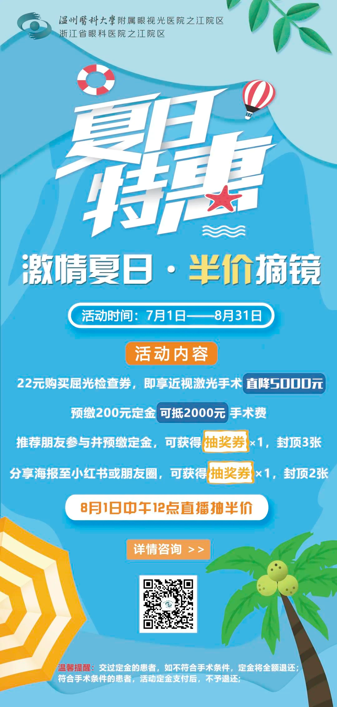 即日起,浙江省眼科医院之江院区推出限时夏日福利,想参加摘镜优惠活动的小伙伴,请扫描以下二维码报名参与↓
